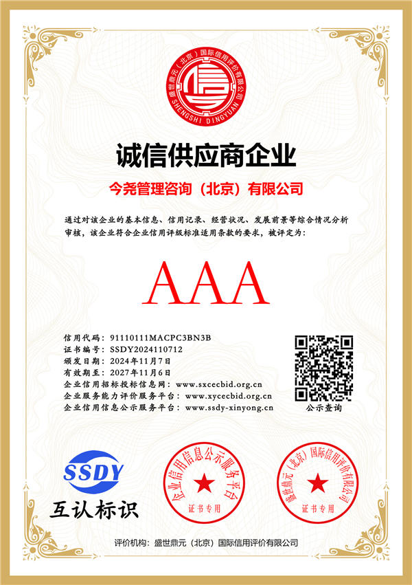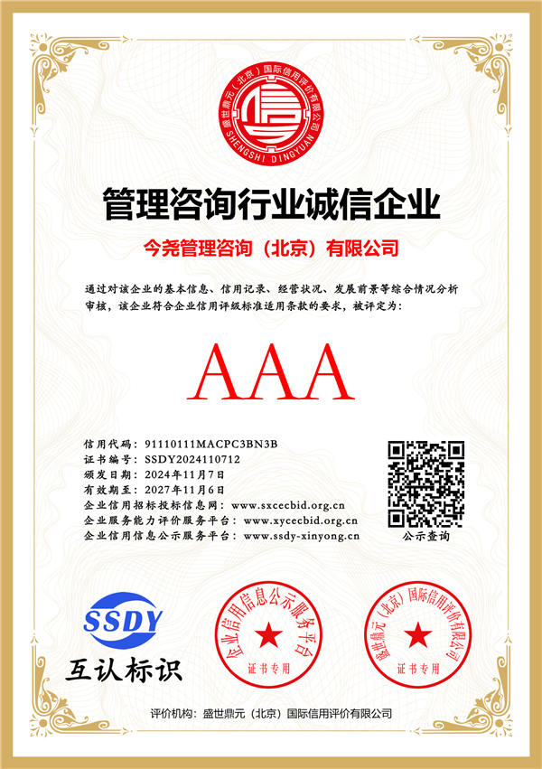获得AAA信用等级证书的优势:1、在“投标战场”,它让你获得先发优势(加分项)。2、在“合作战场”,它让你成为备受信赖的盟友(信任状)。3、在“品牌战场”,它让你身披闪亮铠甲,引人注目(品牌背书)……AAA级信用评价是将企业的“信用”这项无形资产,转化为实实在在的竞争优势和经济效益的核心工具。